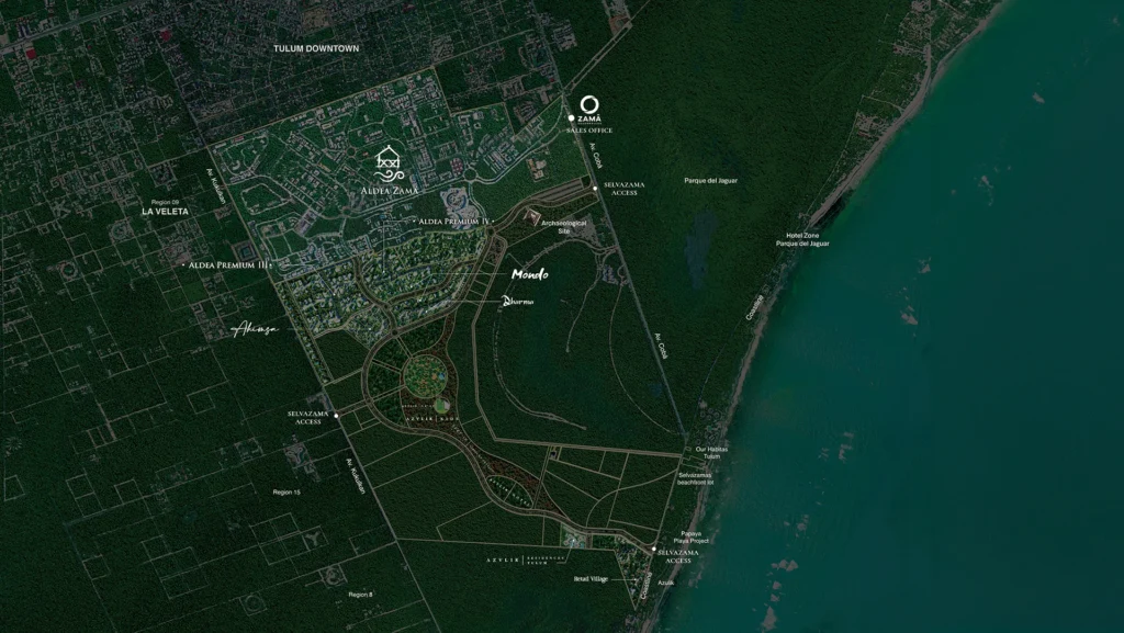 - Prime Location: With our strategic location within Tulum and access to the coastline at the entrance from Coba Avenue, the main avenue that connects downtown with the hotel zone of Tulum, Selvazama guarantees the highest appreciation value in the region. Our master plan includes roads with access to the main avenues, setting the stage for unparalleled growth and prosperity.